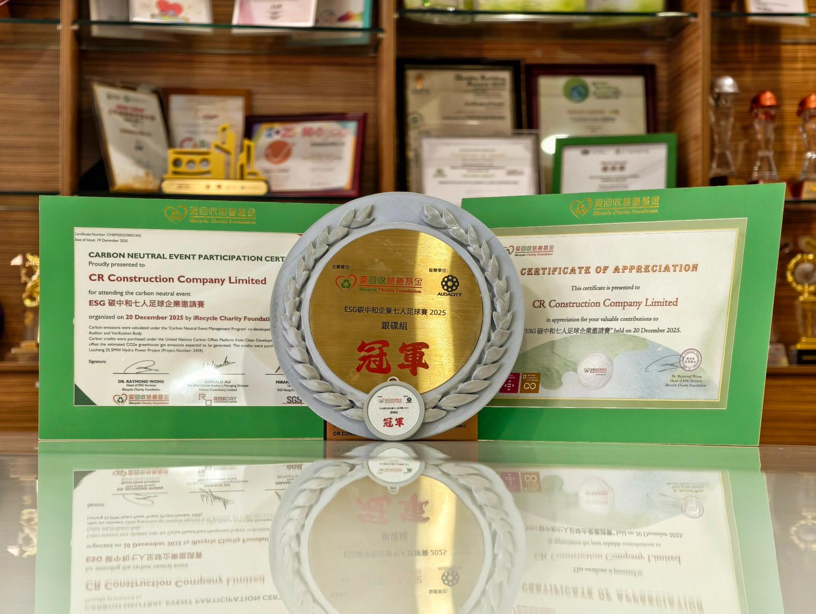 CR Construction won the Silver Plate Championship at the ESG Carbon-Neutral Seven-a-side Corporate Football Tournament, organised by iRecycle Charity Foundation and co-organised by Audacity.